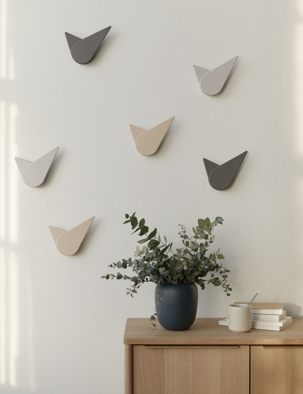 Birdie ist eine skulpturale Wanduhr, die von dem deutschen Designduo Böttcher & Kayser entworfen wurde. Mit ihrem grafischen Aussehen und der leicht humorvollen Gestaltung ist die Uhr ein schönes Beispiel für funktionales Design.