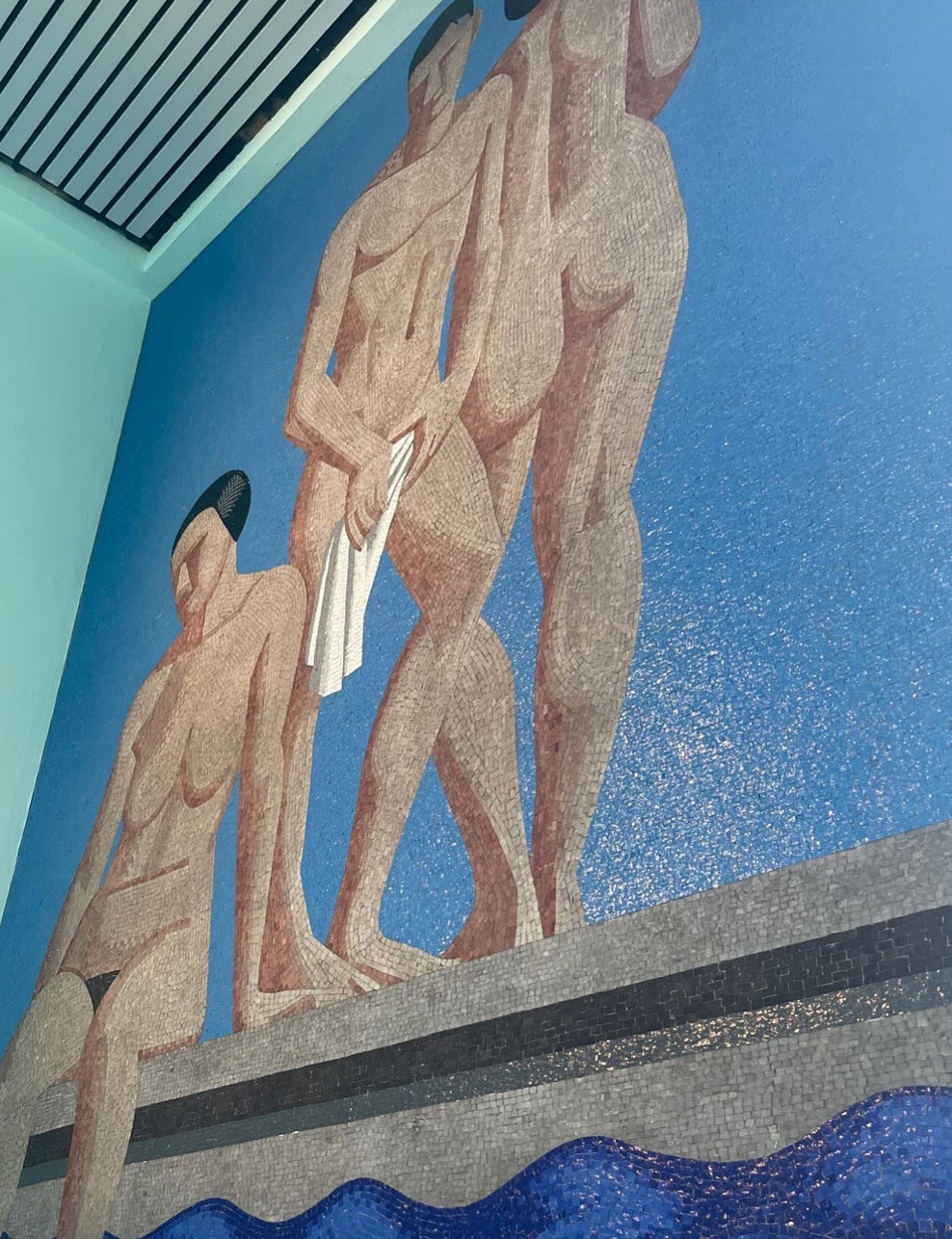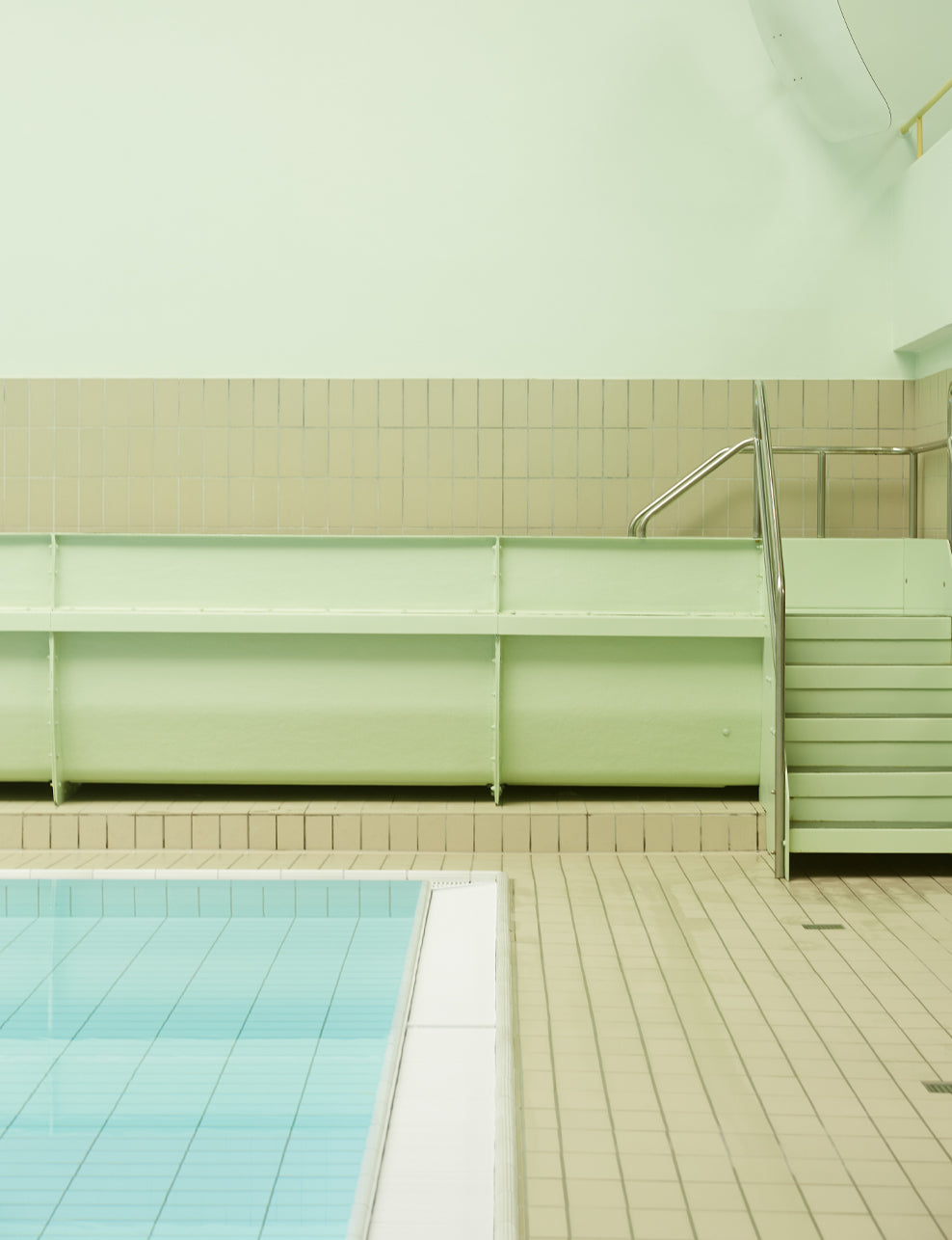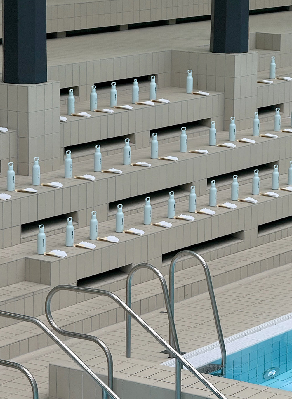 “We wanted to create a space where physical movement and poetic aesthetics meet. There’s something wonderful about presenting elegant silhouettes in a place that smells of chlorine and has clean, simple lines.”